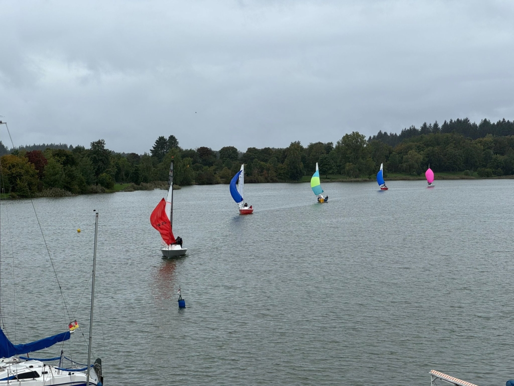 Es war eine gute, wenn auch mutige Entscheidung der Regattaleitung die Wettfahrten ab 14:30 zu beginnen. Nur die Einheimischen vor Ort kennen ihren See, ferner gab es zu keiner Zeit eine Gefahrenlage (kein Warnblinklicht am Seerand ) ,obwohl die düsteren Sturmwolken von Süden bedrohlich aussahen.